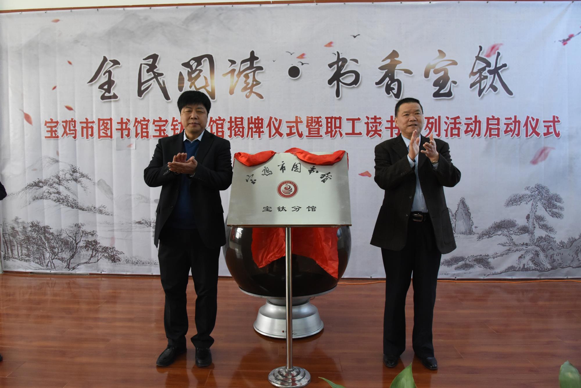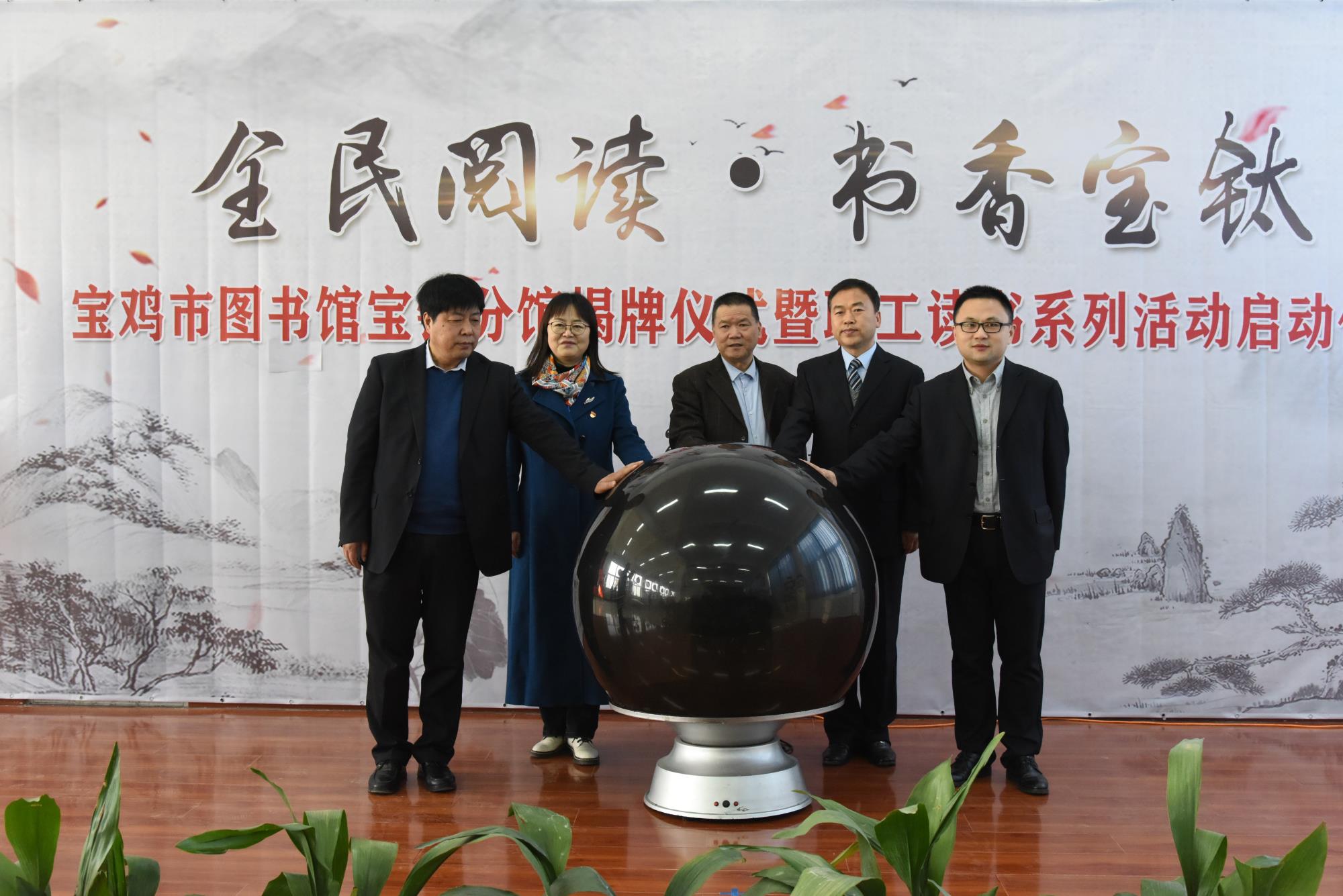 仪式上,王建超和刘掌全为宝鸡市图书馆宝钛分馆揭牌。王建超、贺治民、薛凯、侯文波、刘掌全共同手扶水晶启动球,正式启动宝钛集团“全民阅读•书香宝钛”职工读书系列活动。