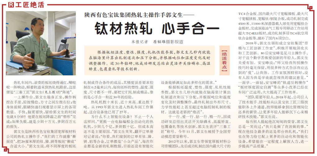 郭文生是陕西有色宝钛集团宽厚板材料公司的热轧主操作手。“我们的工作就像‘擀面皮’,把20厘米厚的钛、镍、镁等板坯‘擀成’合适大小。”郭文生说,将不同厚度的板坯轧制成符合条件的成品,其精度误差要求控制在0.2毫米以内,每块坯料的塑性、温度、强度、尺寸都不一样,要把它们轧制成精品,靠的是心手合一和近30年的经验。