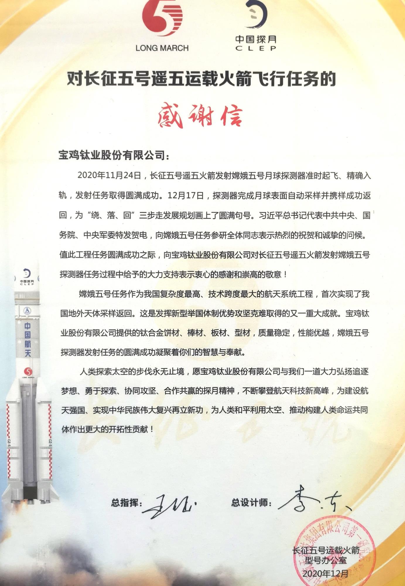 感谢信中说,嫦娥五号任务作为我国复杂度最高、技术跨度最大的航天系统工程,首次实现了我国地外天体采样返回。这是发挥新型举国体制优势攻坚克难取得的又一重大成就。宝鸡钛业股份有限公司提供的钛合金饼材、棒材、板材、型材,质量稳定,性能优越,嫦娥五号探测器发射任务的圆满成功凝聚着你们的智慧与奉献。
