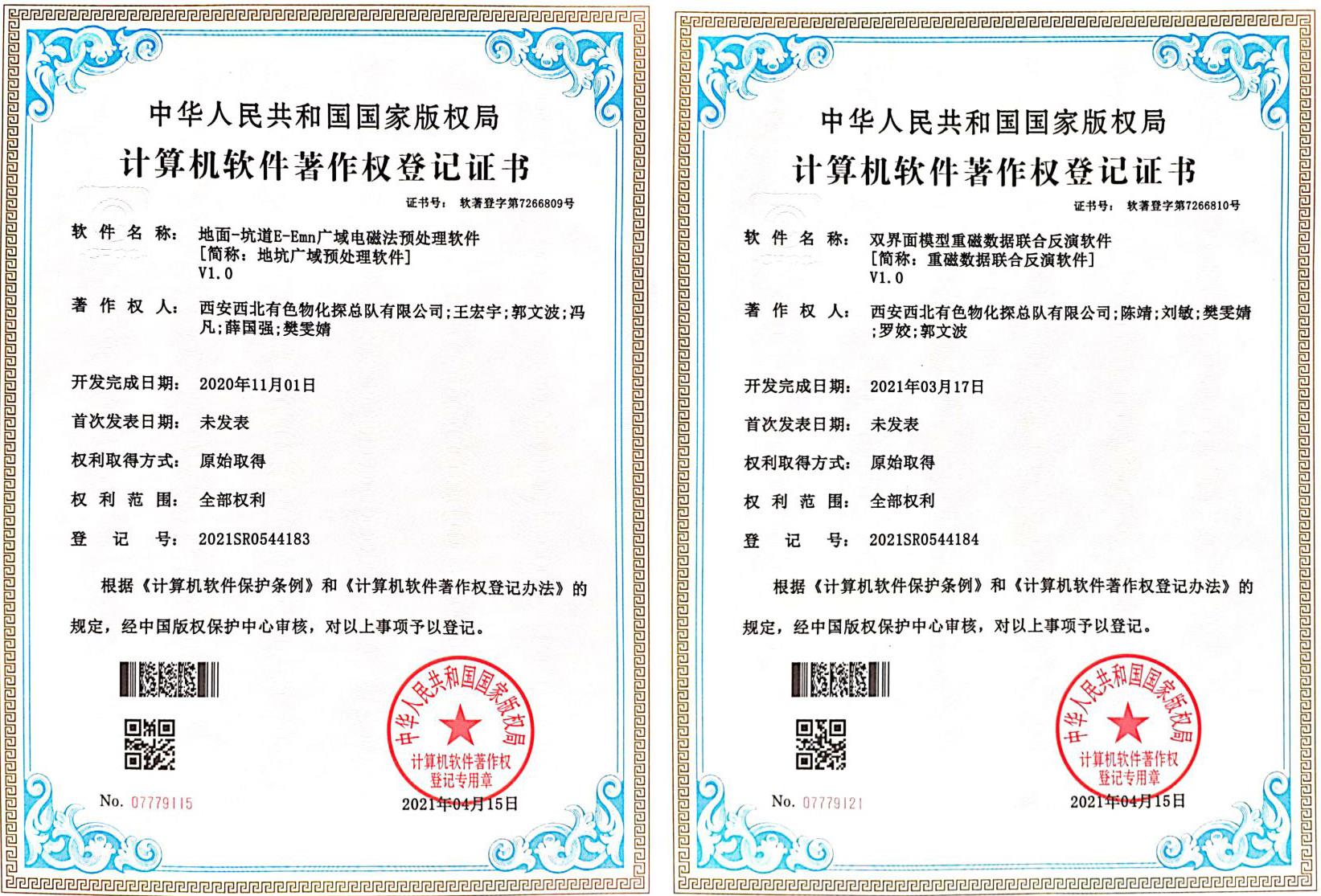 近日,地矿集团物化探总队公司“地面-坑道E-Emn广域电磁法预处理软件”和“双界面模型重磁数据联合反演软件”经国家版权局考证,被正式授予《中华人民共和国国家版权局计算机软件著作权登记证书》,登记号分别为2021SR0544183、2021SR0544184。