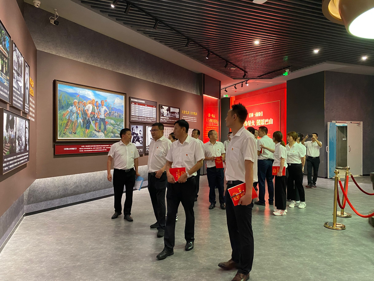 参观万源保卫战战史陈列馆。陈列馆主要陈列万源保卫战中红军遗存的武器弹药、石刻标语等文物,全体人员怀着无比崇敬的心情,驻足细观,一段艰苦卓绝、波澜壮阔的川陕革命斗争史踊跃眼前,在场人员无不为革命先烈抛头颅、洒热血的精神所震撼。