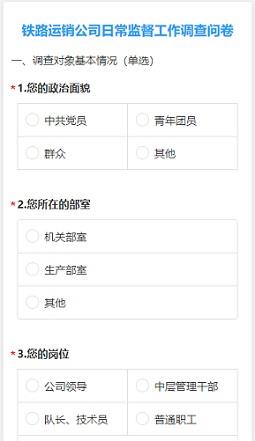 在一线走访的基础上,铁路运销公司于7月21日-7月29日组织开展为期一周的“日常监督工作”线上调查问卷活动。问卷设计8个单选题、8个多选题和1个主观题,内容涵盖铁路运销公司日常监督工作基本情况、日常监督工作范围、监督对象及需要改进的地方等多方面问题。铁路运销公司近50余人参与答卷,通过线上匿名问卷调查的方式,对铁路运销公司日常监督工作的落实和开展情况进行“内部体检、内部自查”,为进一步完善和加强后期日常监督工作奠定坚实基础。