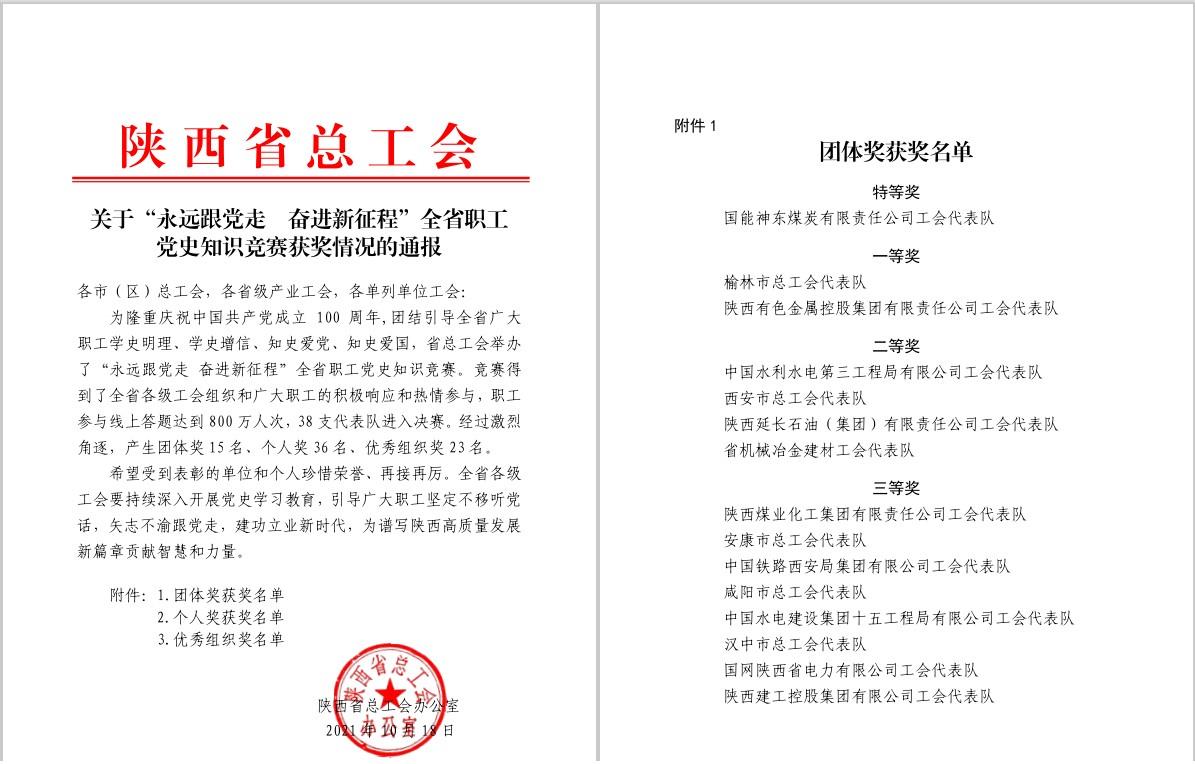 近日,陕西省总工会公布了永远跟党走 奋进新征程”全省职工党史知识竞赛决赛结果,集团公司代表队荣获团体一等奖。本次知识竞赛共有38支参赛队伍,114名选手参加。地矿集团、黄金集团3名选手代表集团公司参赛。
