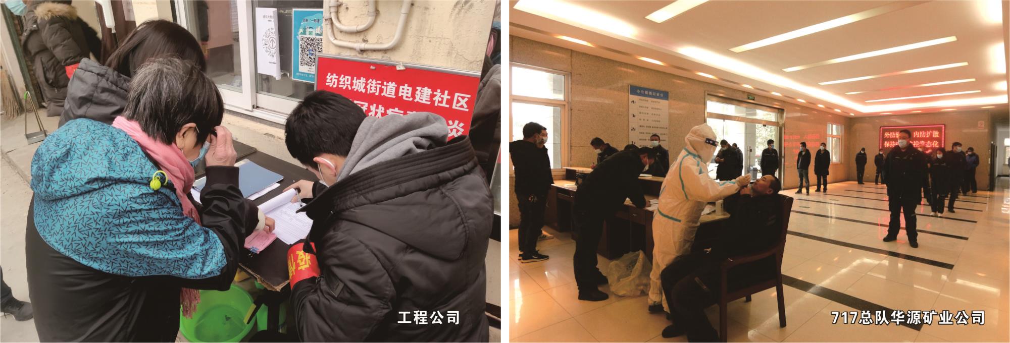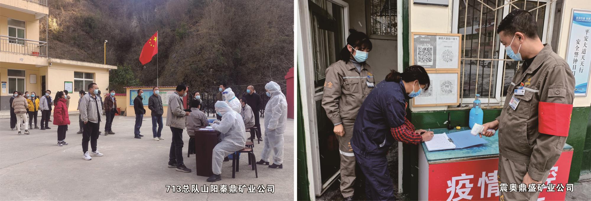 713总队公司、717总队公司各矿山企业和单位及时下发疫情防控工作告知书、公开信,邀请医务人员为在岗职工进行核酸检测,向职工发放口罩等防疫物资,对返岗员工进行健康筛查,合理调整生产工作节奏。重点加强矿区、厂区出入管控,严格落实扫码测温、戴口罩、出示行程卡及48小时核酸检测等措施,做到早发现、早报告、早处理,严防“外来输入”。同时,引导符合新冠疫苗接种条件尚未接种者及符合“加强针”注射条件者,尽快完成疫苗接种,加快构筑免疫屏障。