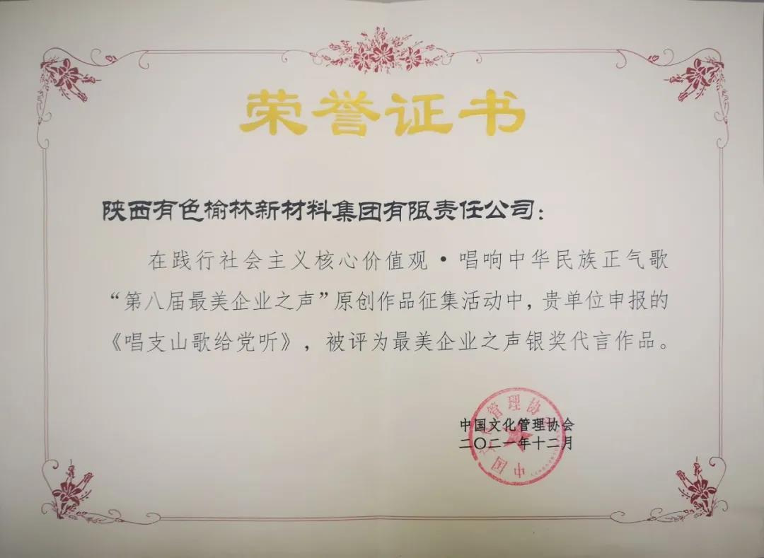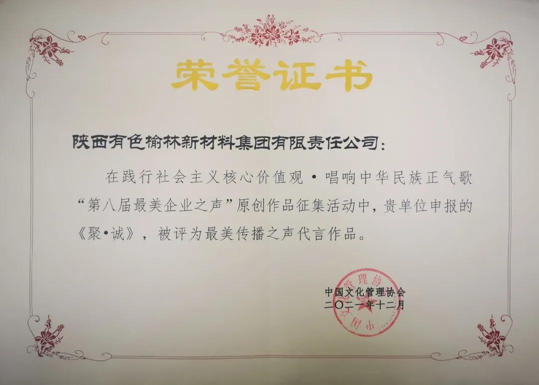 在中华文化管理协会举办的“第八届最美企业之声”征集评选中,公司以优异成绩在800家企事业单位中脱颖而出,宣传片《聚·诚》荣获最美传播之声代言作品,原创短视频《唱支山歌给党听》荣获最美企业之声银奖代言作品。