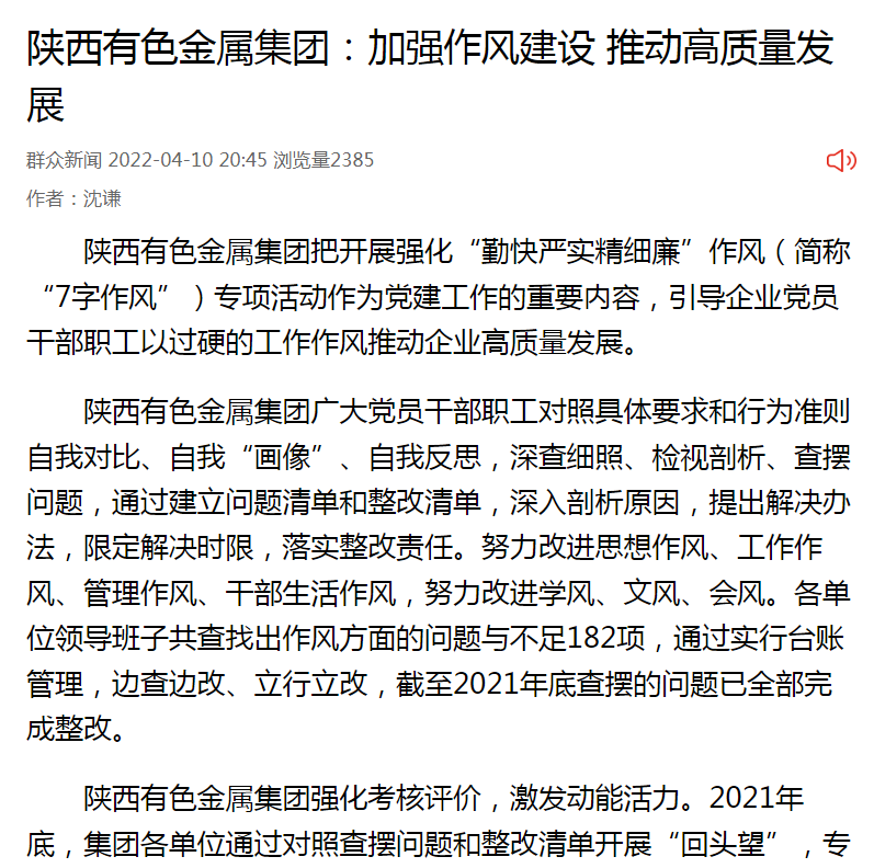 作风建设是干事创业的重要保障,通过开展强化专项活动,全集团上下整体精神风貌昂扬奋进,党员干部职工干事创业劲头更足,工作作风明显加强,各方面工作质效进一步提升。2021年集团实现营业收入1618.18亿元,同比增长19.86%;利润总额25.15亿元,增长226.2%。钛材、粒状多晶硅、黄金等产品产量实现大幅增长。为2022年威廉希尔williamhill中文“高质量项目建设年”深入推进打下坚实思想、作风和经济基础。
