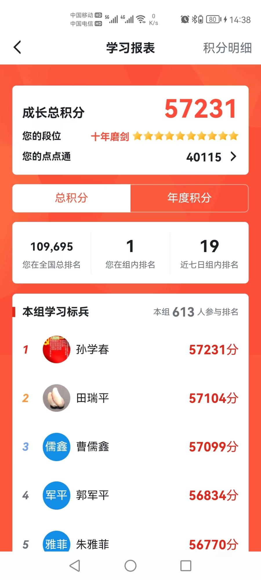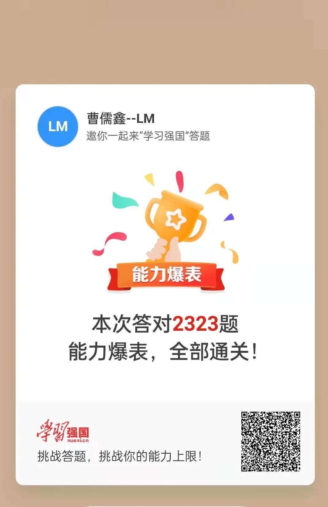 目前,全公司共有注册学员613人,学员参与度、活跃度均在威廉希尔williamhill中文各单位长期处于领先位次,日均积分经常位居第一名。截止4月27日,铝业分公司孙学春以总积分57289分,排名全国第108949名,2022年度积分5848分,排名全国第1188名,全公司学习强国学员总积分55000分以上达136人,党委宣传部田瑞平和阳极分公司曹儒鑫挑战答题先后以2288和2323题顺利通关。