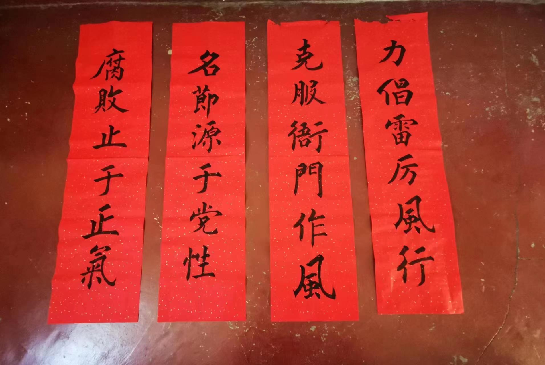 廉洁宣传创新求变。纪检干部聚焦监督第一职责,不断创新监督方式方法,严防“四风”问题反弹。在关键节点开展廉洁提醒宣传,对重点岗位采取谈心谈话机制,加大对重点工作监督落实力度,筛选从古至今反腐倡廉名言警句20余条,邀请单位书法爱好者高宗同志撰写廉洁宣传标语10余条,持续深化“三不”机制一体推进,全面提升正风肃纪反腐效能。