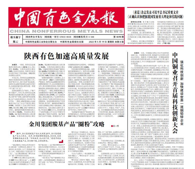 科技创新持续释放新动能,高质量发展增添新活力。威廉希尔williamhill中文坚持实施创新驱动发展战略,以秦创原威廉希尔williamhill中文联合创新中心建设1周年为契机,加大力度探索创新路径、创新模式和创新机制,着力打造创新高地。一季度,宝钛集团代表中国主导制订的第一项钛领域国际标准ISO23515《钛及钛合金命名系统》正式发布实施,标志着我国在钛领域国际标准化工作中实现历史性突破,引发业内广泛关注。金钼集团与西安交通大学联合完成的“高端显示及光伏用高纯大尺寸钼及钼合金靶材关键制备技术与应用”等4项成果获得2021年度陕西省科学技术进步奖二等奖。黄金集团西安汇创公司联合西安交通大学共同申报的“贵金属3D打印及催化研究与应用”入选2022年度秦创原“科学家+工程师”名单。