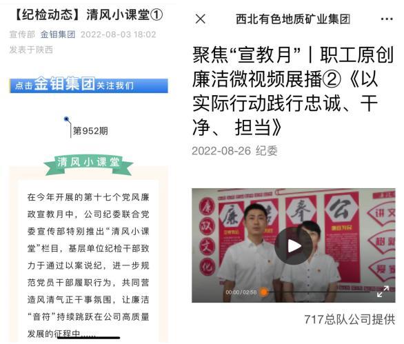 清风课堂扬清风。金钼集团特别拍摄制作了十期“清风小课堂”栏目在微信公众号展播,通过以案说纪的形式,将党纪法规转化为通俗易懂、深入浅出的学习内容,进一步延伸宣传教育触角,让清廉文化深入基层、贴近广大干部职工。地矿(黄金)集团开展“聚焦宣传月”廉洁微视频作品展播活动,以职工群众“喜闻见乐”的方式开展廉洁宣教,让党员干部职工在拍摄中受教育、在观看中得体会。