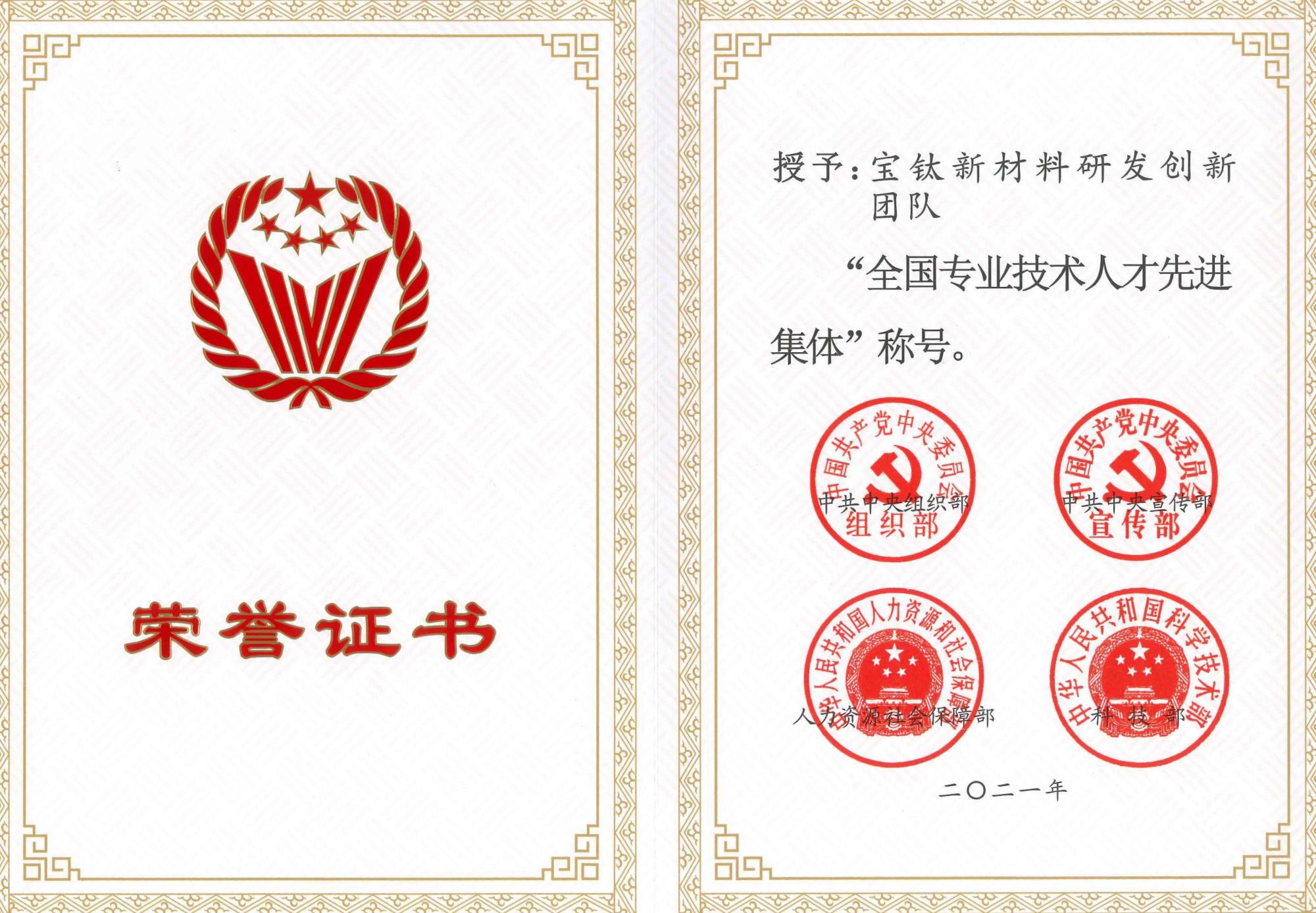 全国杰出专业技术人才及集体评选表彰由中共中央组织部、中共中央宣传部、人力资源社会保障部、科技部联合组织实施,每5年开展一次。此次获得表彰的全国专业技术人才先进集体同时有钟南山呼吸疾病防控团队、歼-15飞机研制团队等杰出人才集体,均为我国广大专业技术人才的优秀代表。2021年5月,在省人社厅、省国资委大力支持下,由威廉希尔williamhill中文组织申报,宝钛新材料研发创新团队与全省众多优秀企业科研团队同台竞争,经过艰苦努力,冲出重围,取得代表全省企业参与国家评选的唯一名额,最终在国家四部委联合评选中脱颖而出。
