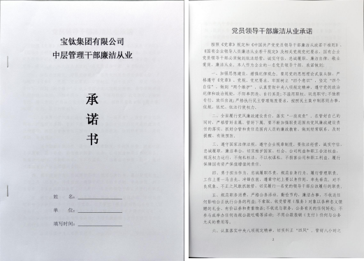 廉政谈话结束后,宝钛集团纪委还向新任职干部发放了《宝钛集团有限公司中层管理干部廉洁从业承诺书》,要求新任职干部分别进行纸质版、电子版承诺书和个人廉政档案的填写,为新任职干部建立廉政档案。