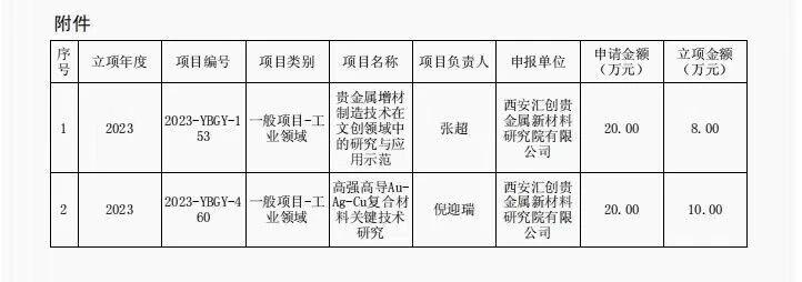 近日,陕西省科技厅下发《陕西省2023年科技计划项目补助经费的通知》,公布了2023年陕西省重点研发计划项目,汇创公司申报的《贵金属增材制造技术在文创领域中的研究与应用示范》和《高强高导Au-Ag-Cu复合材料关键技术研究》项目位列其中。