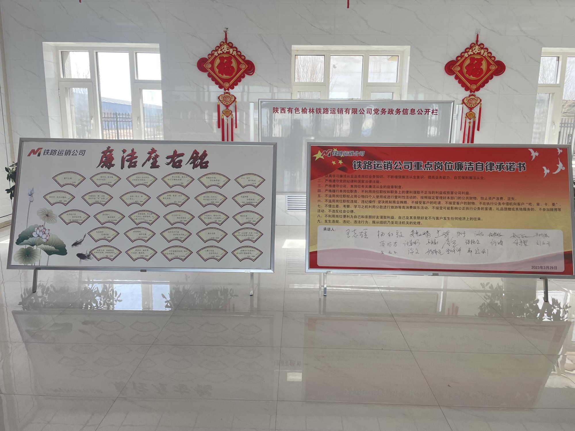 3月中旬,铁路运销公司在全体党员干部中开展廉洁格言和廉洁座右铭征集活动,共征集廉洁座右铭30条,由铁路运销公司统一制作廉洁格言牌发放至每位党员,并制作座右铭海报1张,张贴至办公楼处。与此同时,在组织生活会上22名党员结合自身岗位特点,开展廉洁从业讨论,并进行公开廉洁自律宣誓,签订廉洁承诺书,使党员干部进一步意识到廉洁从业、廉洁律己的重要性,唤起党员干部和关键岗位人员的廉洁自律意识,切实做到“守廉洁 懂规矩 讲纪律”。
