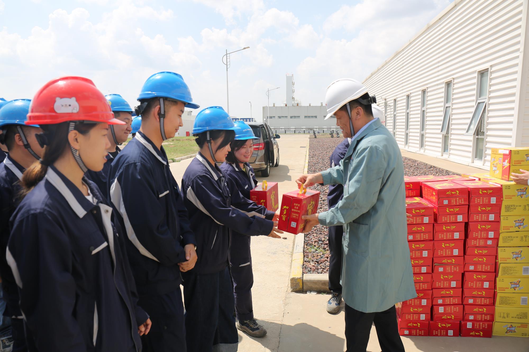 王小庆向大家传达了集团公司党委、工会对公司职工的关心与关怀,对奋战在一线的广大职工表示亲切的问候和衷心的感谢,并为生产一线职工送去西瓜、凉茶、苏打水等防暑降温慰问品。并叮嘱职工们在炎炎夏日下要注意休息、劳逸结合,在保证身体健康的情况下再创佳绩、再建新功,为天瑞硅材料的发展添砖加瓦。