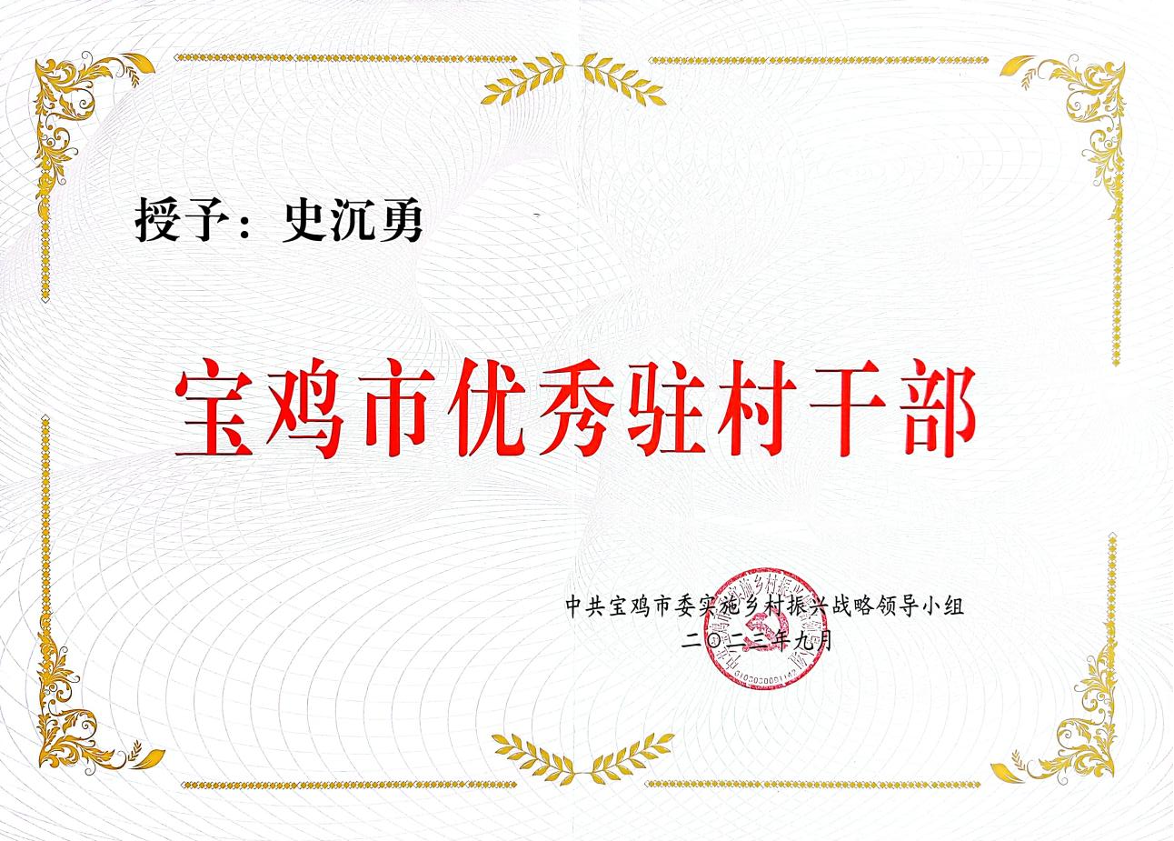 扎根基层沃土,谱写奋斗之歌。近日,宝鸡市驻村帮扶工作推进会召开。会上,中共宝鸡市委实施乡村振兴战略领导小组对全市驻村帮扶工作先进集体和先进个人进行了表彰。地矿集团下属企业铅锌集团凤县分公司选派的千阳县城关镇冉家沟村原第一书记史沉勇同志荣获“宝鸡市优秀驻村干部”称号。