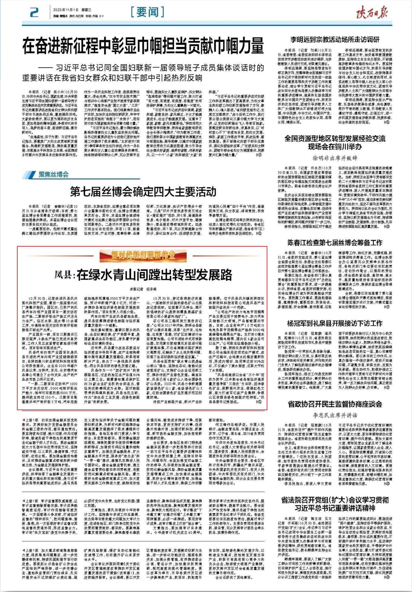 编者按:陕西日报2023年11月1日2版刊发《凤县:在绿水青山间蹚出转型发展路》一文。其中,记者走进地矿集团权属企业铅锌集团凤县分公司(原陕西震奥鼎盛矿业有限公司),采访公司绿色矿山建设成果。全文如下: