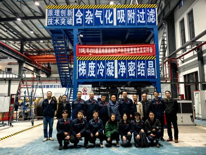 近年来,装备科技公司联合西安交通大学单智伟教授研究团队,经过多年潜心研究和科研攻关,基于气态原子选择性分离来除杂的新思路,吸收消化“含杂气化,梯度冷凝,吸附过滤,净密结晶”系列技术,研发制造了“10吨/年Mg99995级高纯镁半连续化生产示范装置”,以期实现99.995%高纯镁的低成本规模化稳定制备。2020年,开始筹划并进行相应原理技术攻关、验证;2022年,正式着手工程方案设计,并历经了八轮论证评审;今年1月,该示范装置开始进行设备制造,8月进入驻基地安装、调试,11月正式交付。