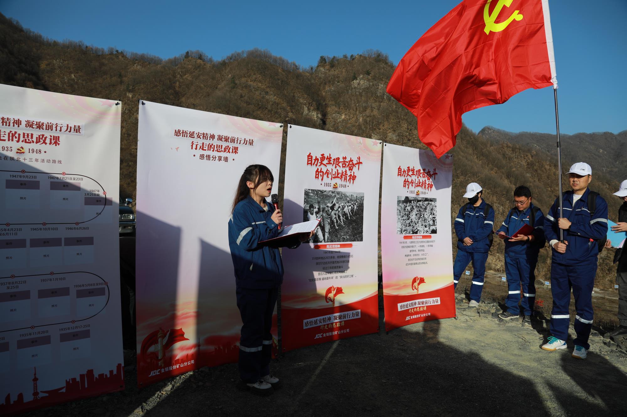 为确保思政课取得实实在在成效,金钼集团矿山分公司党委提前筹划,精心准备,在总长约6公里的木子沟尾矿库沿途,设置4个集合点,放置“坚定正确的政治方向、解放思想实事求是的思想路线、全心全意为人民服务的根本宗旨、自力更生艰苦奋斗的创业精神”四块红色展板,通过场景模拟、现场讲述等方式,系统回顾在百年党史中熠熠生辉的延安精神,滋养初心、淬炼灵魂。