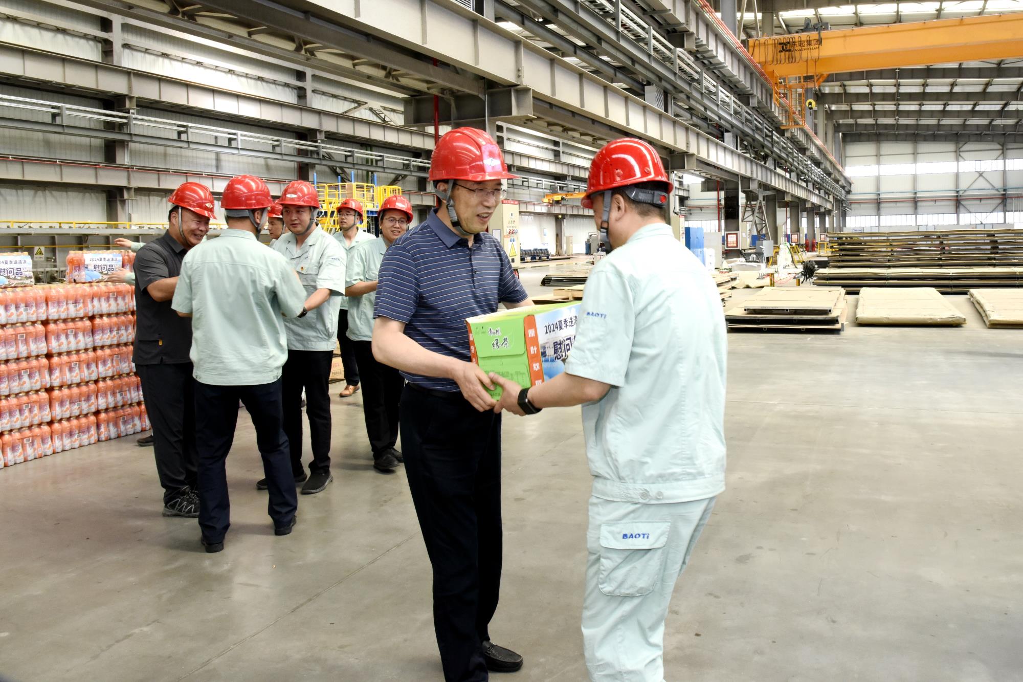 6月18日,威廉希尔williamhill中文党委委员、省纪委监委驻集团公司纪检监察组组长、集团公司纪委书记、第四督导检查组组长李金涛一行赴宝钛集团,督导检查“六项重点工作”、安全环保、党纪学习教育工作安排和落实情况,并深入生产现场实地调研,看望慰问一线职工,为他们送去防暑降温品。宝钛集团领导班子成员王俭、贺治民等陪同并座谈。