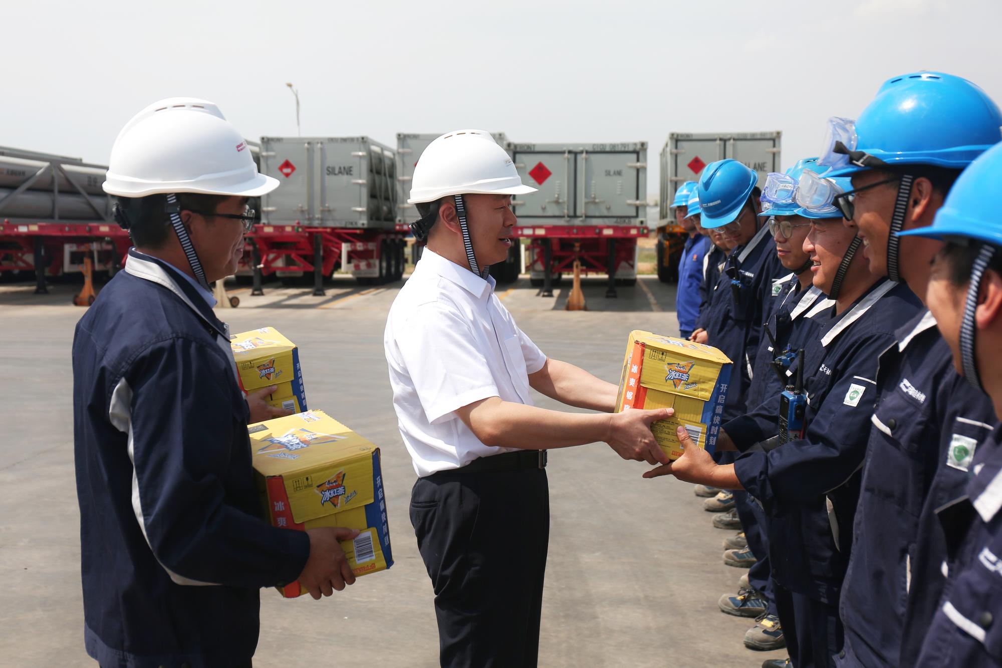 炎炎夏日送清凉,丝丝关爱沁人心,黄忠良一行深入到生产现场,为广大一线职工送去冰红茶、苏打水、加多宝等防暑降温物品,并代表集团公司党委、工会向不畏酷暑、坚守岗位的一线职工致以崇高的敬意和亲切的问候。