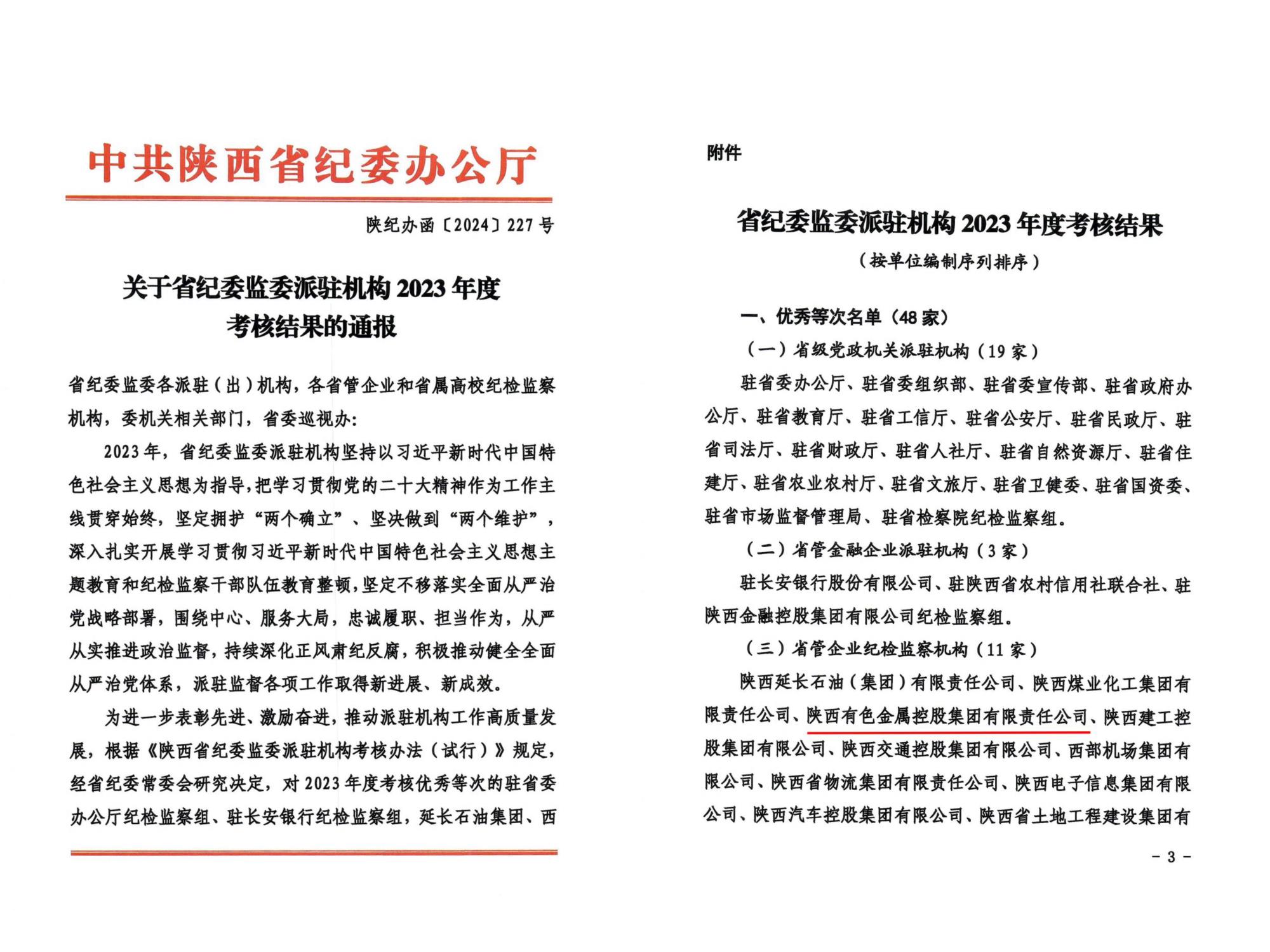 日前,陕西省纪委办公厅印发《关于省纪委监委派驻机构2023年度考核结果的通报》,威廉希尔williamhill中文纪委在33家省管企业纪检监察机构考核中获评优秀等次。这是集团公司纪委连续第四年获评省纪委监委派驻机构考核优秀等次,体现了省纪委监委对集团公司纪检监察工作的充分肯定和鼓励鞭策。