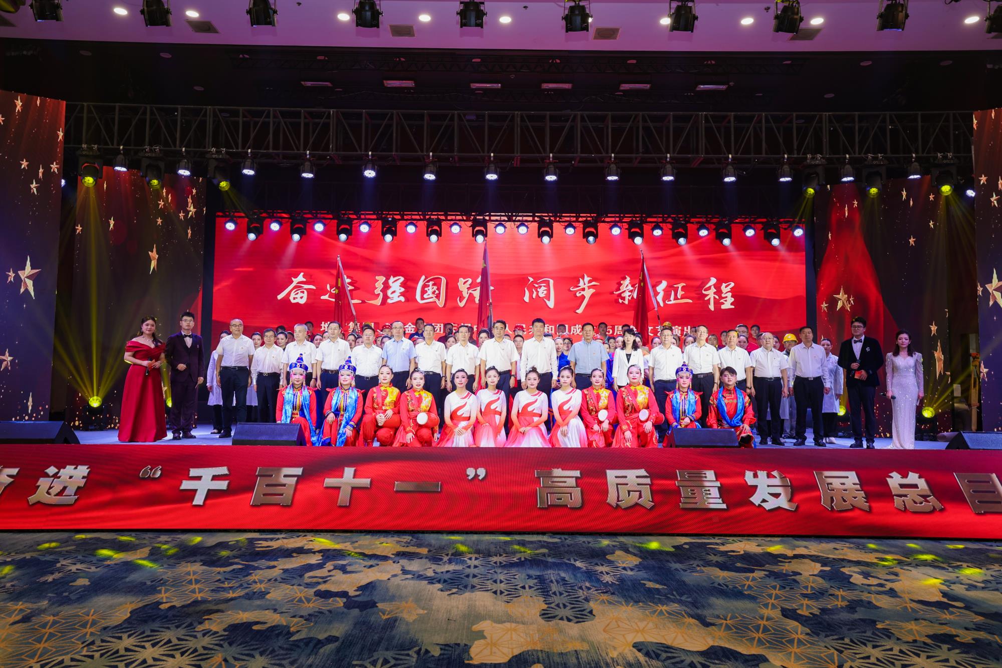 盛世欢歌庆华诞,更立壮志谱新篇。9月24日,地矿集团、黄金集团举行庆祝新中国成立75周年文艺演出暨党建成果表彰大会,厚植爱国情怀,砥砺强国之志,献礼新中国成立75周年。同时,对两集团近年来党建工作成果进行表彰,号召广大干部职工团结奋进、拼搏创新,全力推动两集团高质量跨越发展。