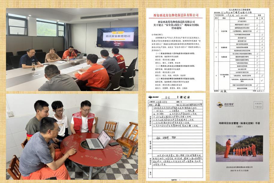 在“湖北省引江补汉地空瞬变电磁物探项目”中,现场安全团队按照公司“安全员+岗位工”建设方案,结合《地勘项目安全管理<标准化定制手册>》《员工安全手册》等文件要求,坚持以制度规范管流动项目、以标准流程管现场作业、以考核评价管人员行为,从项目前培训、上岗前教育、飞行前交底、收工前总结等方面,打造了一套“菜单式”安全管理模式。项目部严格落实“一岗两清单”,负责人兼安全员与队员逐一签订责任书,利用“一文件一主题”每日班前会、“袖标+红马甲”、“手指口述”等形式,规范推行安全标准化管理。面对无人机新领域的安全风险,项目部认真学习地勘测绘行业安全生产指引和无人机风险隐患判定等规范,聚焦野外踏勘、仪器校验、测量放线、无人机航测、设备维保等工序,深入开展新场景下的风险辨识、应急演练和隐患排查治理,确保安全风险可控、隐患闭环管理。