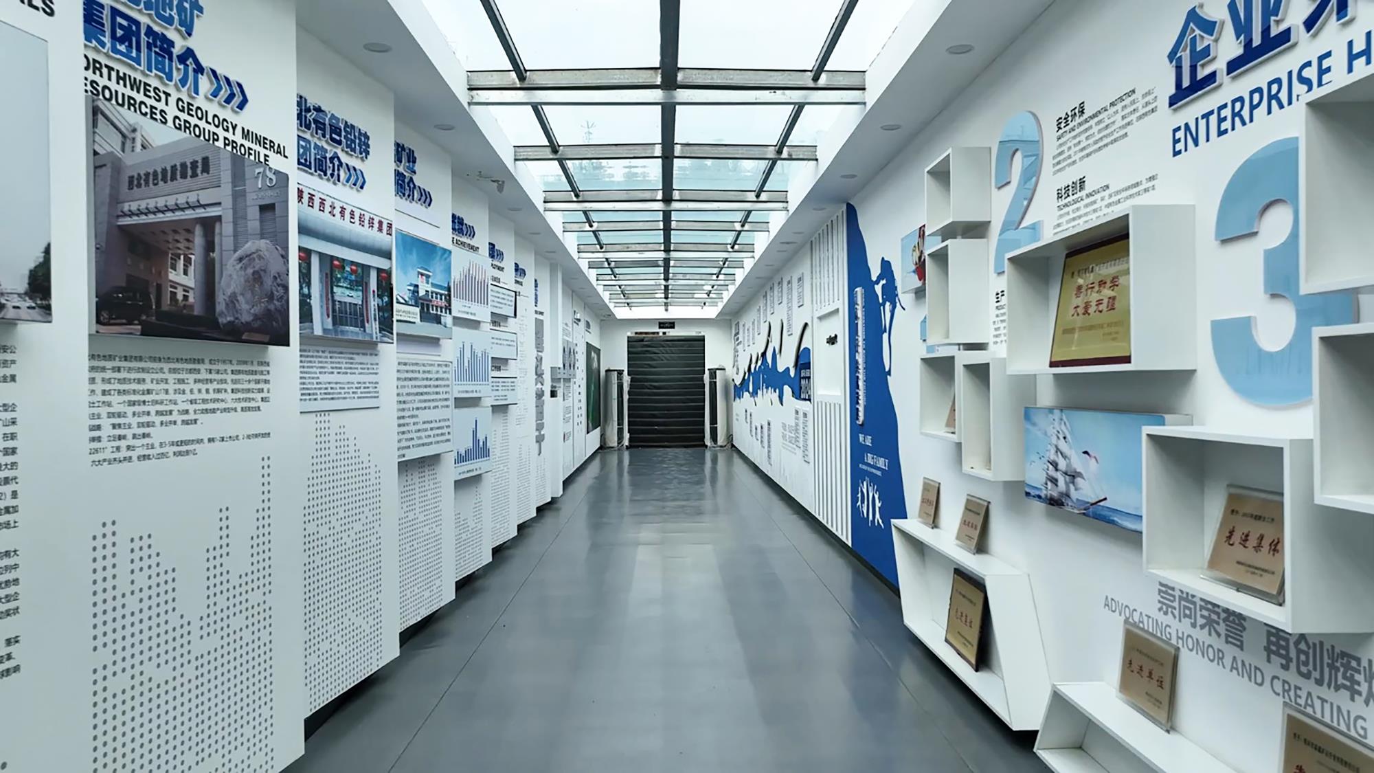 工程公司廊道文化充分吸收和融合了行业文化元素,“三光荣、四特别”地质精神为廊道设计提供了丰富的灵感,一楼是企训宣传栏,二楼分为企业愿景、价值观、经营理念、管理理念等8个模块,三楼是人才理念和先进人物事迹展,四楼是各产业板块及重大典型工程案例,五楼是对文物保护特色产业的集中展示。每一块展板都蕴含着丰富的信息和深刻的启示,方寸之间,文化尽显。在森鑫矿业公司选矿厂二楼办公区,企业文化长廊的设计从矿山属性出发,以体现安全、专业、可靠的蓝色为主色调,各板块使用了不规则图形来表现内容的个性化,避免了刻板的压抑感,凸显了公司积极向上的文化氛围。同样,在物化探总队公司、研究院公司、717总队公司、铅锌集团本部和凤县分公司等单位,他们通过整合创新设计,运用每一块展板、每一行文字、每一幅图画,把办公区走廊、楼道、休息台变成了回顾企业历程、实施企务公开、展示技术成果、开展法治教育、宣介党建品牌、倡导文明礼仪、弘扬廉洁文化的艺术长廊。图文并茂、灵活多样的展陈形式,让员工在驻足观看学习的同时,将企业文化理念内化于心、外化于行。