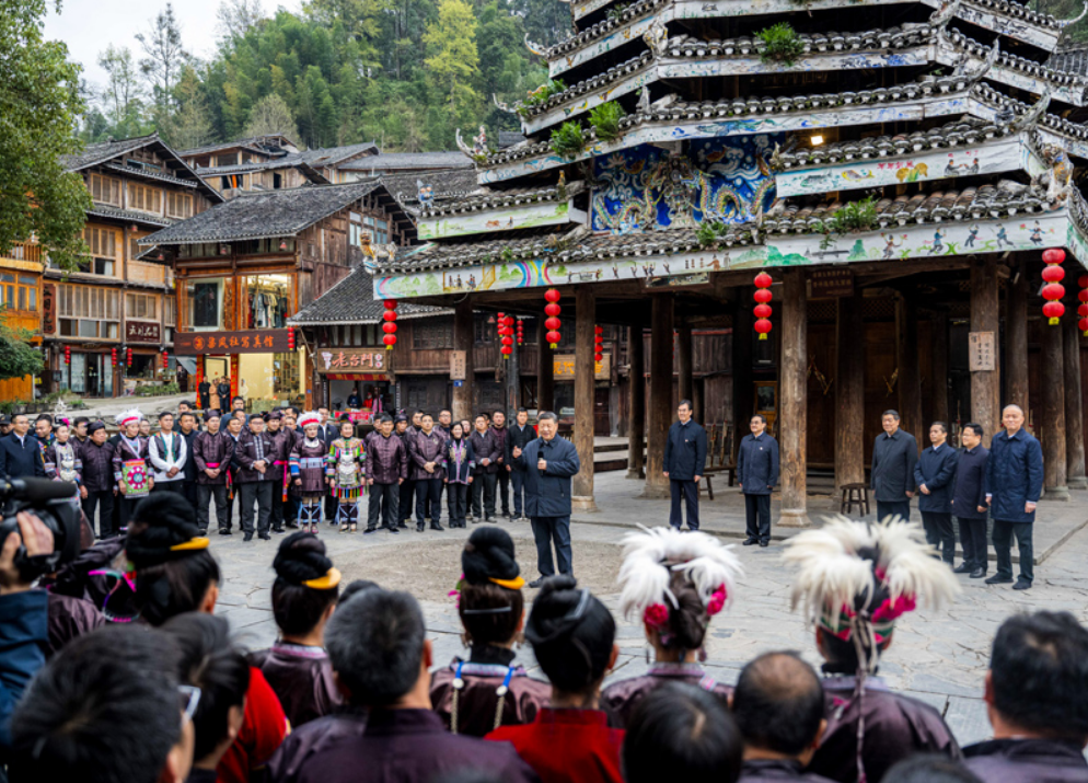 这是17日下午,习近平在黔东南州黎平县肇兴侗寨考察时,同村民们亲切交流。