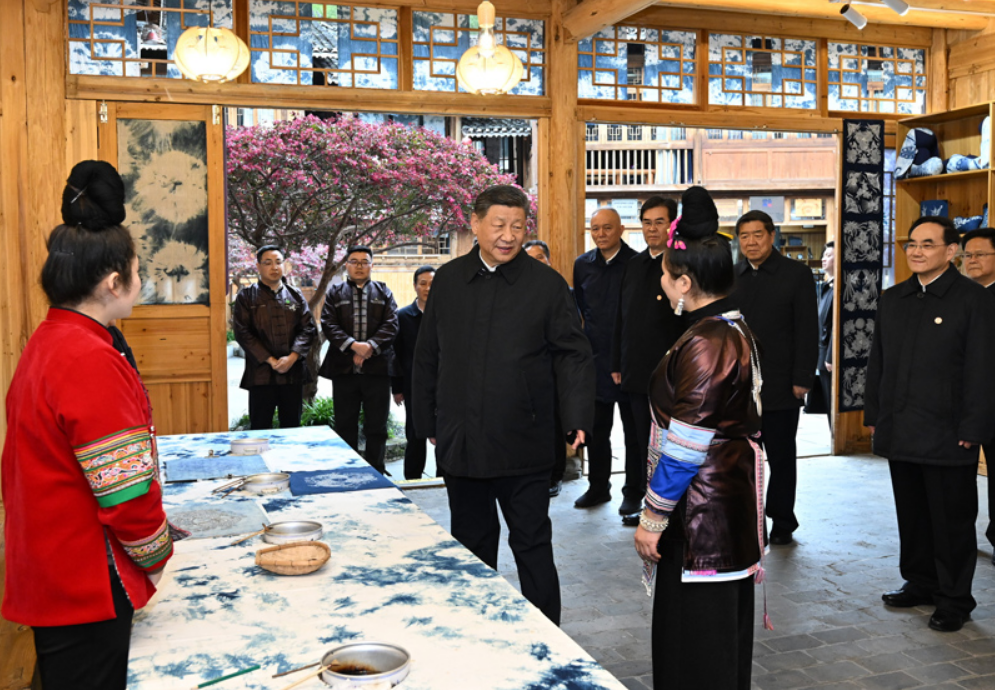 这是17日下午,习近平在黔东南州黎平县肇兴侗寨侗乡特色产业基地考察。