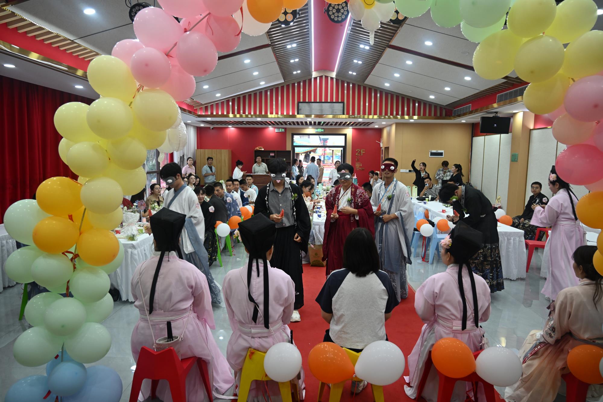 活动伊始,身着典雅汉服的青年男女在花月荟主入口签到,领取专属胸针与手环,于古韵氛围中沉浸式感受传统文化魅力。在随后的游园定向挑战环节,男女嘉宾在缤纷花海中合影留念,协力完成“终极考官”设定的趣味任务;高潮迭起的“喜从天降抛绣球”点燃全场热情,成功抢得绣球的嘉宾组成“绣球CP”;在小剧场二楼,“爱情实验室”趣味游戏轮番上演,“桃花朵朵开”“蒙眼递西瓜”……现场气氛温馨融洽。在主持人的鼓励下,多位嘉宾勇敢表达心意,最终公司5名单身青年成功牵手,收获全场热烈掌声与美好祝福。