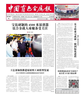2016年6月1日~7日,由陕西有色集团下属宝钛集团研制的4500米深潜器钛合金载人球舱,参加了主题为“创新驱动发展、科技引领未来”的国家“十二五”科技创新成就展,习近平总书记、李克强总理等党和国家领导人参观了展览,并对宝钛研制的深潜器钛合金载人球舱给予充分肯定,并提出殷切希望。国家领导人到展台来参观和对企业的勉励,让有色行业、钛行业,尤其是宝钛人群情激奋、备感自豪,这也是对宝钛科技创新及中国钛工业发展的巨大鼓舞。