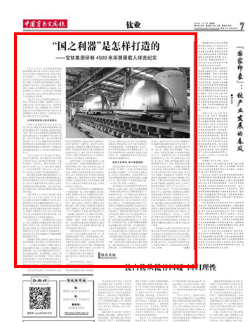 习近平总书记在全国科技创新大会上指出:“科技是国之利器,国家赖之以强,企业赖之以赢,人民生活赖之以好。”宝钛集团承担国家重大项目关键课题,努力开展科技创新、技术攻关和新材料研制,为倾力打造深潜器钛合金载人球壳这一尖端科技产品、国之利器,作出了应有的贡献。