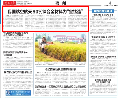 9月5日,记者从省国资委获悉,作为我国航空航天用钛合金材料的主要研发生产基地,陕西有色宝钛集团为我国航空航天产业提供了90%的钛合金材料用量,是我国新型战机和大飞机用钛合金的主要供应商。