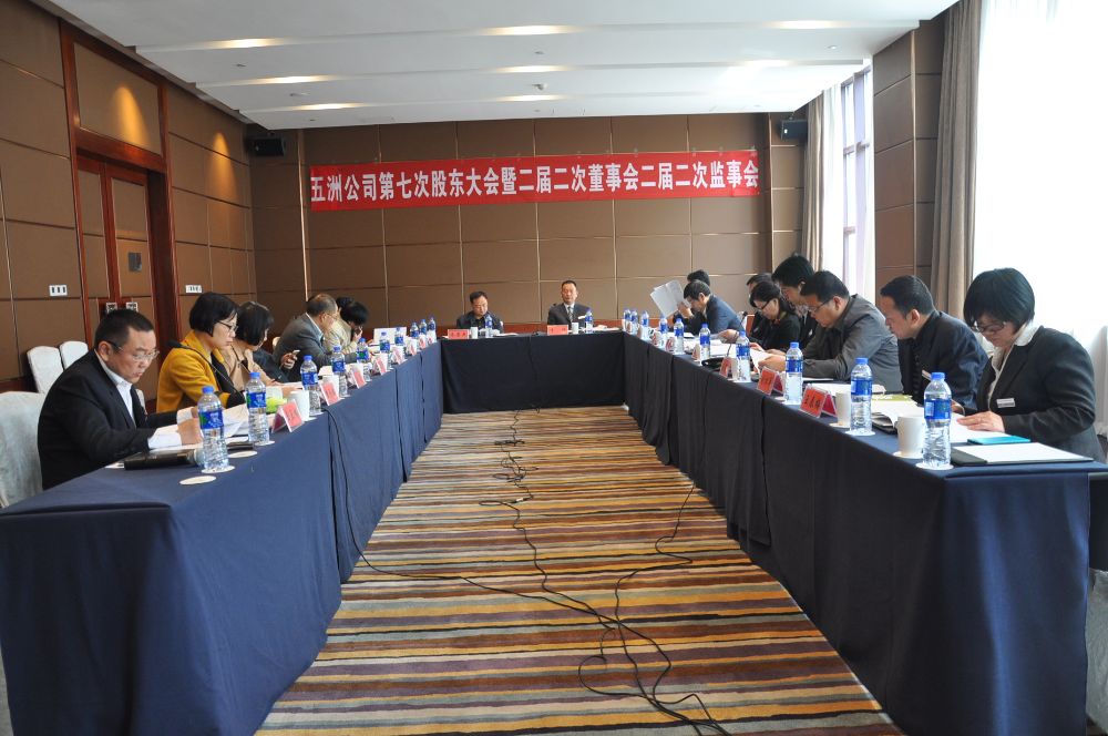 第七次股东大会(2014年年会)暨二届二次董事会由集团公司副总经理、五洲矿业董事长李炜主持。会议审议通过了公司总经理艾军代表公司做的《多措并举、适应新常态,砥砺前行、实现公司持续稳健发展》工作报告和《2014年固定资产投资完成情况报告及2015年投资计划》及《陕西五洲矿业股份有限公司“十三五”发展规划(摘要)》;审议批准了财务部主任王春梅代表公司做的《2014年度财务决算及2015年度财务预算报告》;审议通过了李炜董事长做的《2014年度董事会工作报告》和公司监事会主席申占鑫做的《2014年度监事会工作报告》;审议通过了《关于陕西五洲钒金属材料科技有限公司氮化钒生产线炉窑改造工程的议案》,原则通过《陕西五洲矿业股份有限公司关于建设100吨/年高纯金属钒项目的议案》,要求按照项目审批、建设和固定资产投资规定程序,推进有关工作。