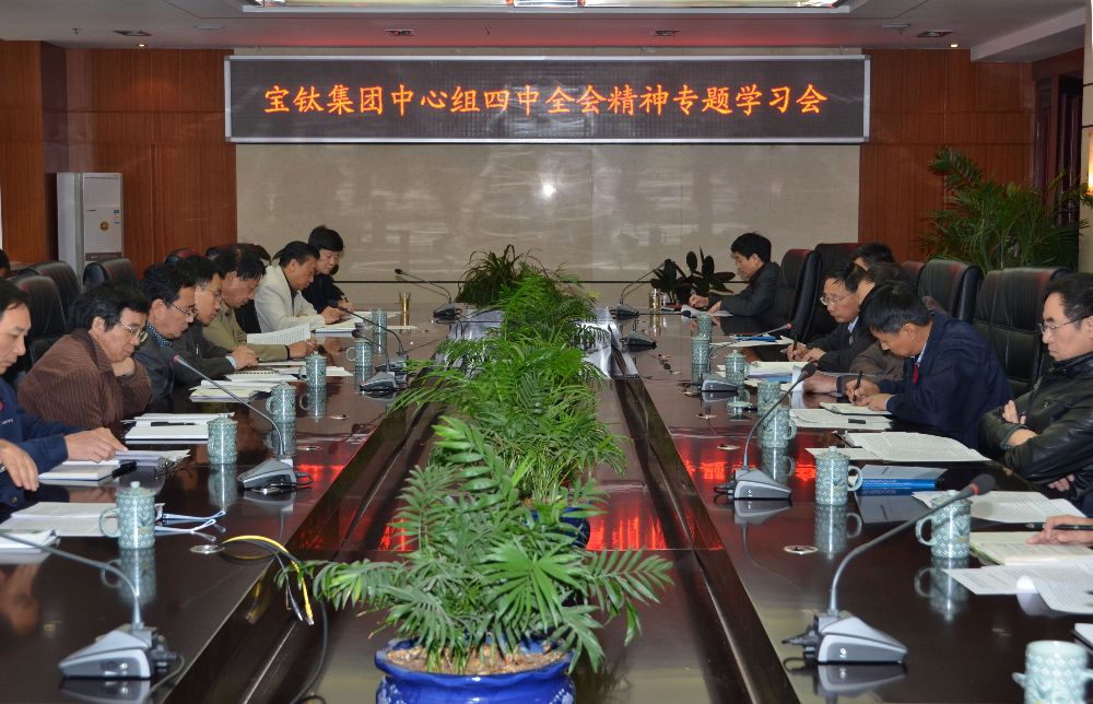 10月28日上午,宝钛集团党委中心学习组成员在公司九楼会议室,集中学习了《中国共产党第十八届中央委员会第四次全体会议公报》、《人民日报》社论《实现依法治国的历史跨越》、中央纪委书记王岐山在中纪委第十八届四次全会上的讲话《治国必先治党,治党务必从严》等五篇专题文章,深刻领会了中共中央关于全面推进依法治国,建设中国特色社会主义法治体系,建设社会主义法治国家的精神。学习会由宝钛集团党委书记王文生主持,宝钛集团领导班子成员及部分副总工程师、党委部门负责人参加了学习会。