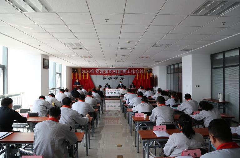 4月9日上午,光电科技、华山半导体两公司在研发大厦六楼培训室召开2020年党建暨纪检监察工作会议。两公司领导班子成员、各单位(部门)负责人、支部书记、关键岗位人员代表、新能源公司代表参加会议。党委副书记、总经理田建之主持大会。