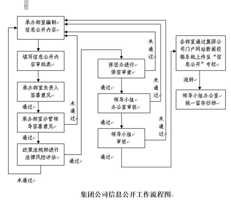 信息内容审核。集团公司各部室编制完成相关信息内容后,及时填写《集团公司信息公开审批表》(附件),报送政策法规部进行法律风险评估,随后提交保密办进行保密审查,并履行领导小组审核程序。