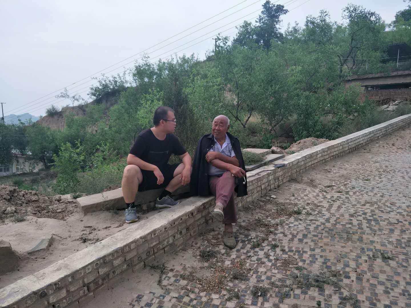驻村第一书记王渊(左)和村民冯文和(右)拉家常