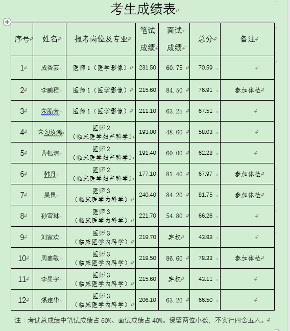 西北有色医院2020年省属事业单位公开招聘面试环节已经结束,依据《事业单位人事管理条例》《陕西省事业单位公开招聘工作人员实施办法》及2020年陕西省省属事业单位公开招聘工作人员公告要求,考试总成绩,按照与岗位招聘计划1:1的比例从高分到低分确定参加体检人员。现将有关事项公告如下: