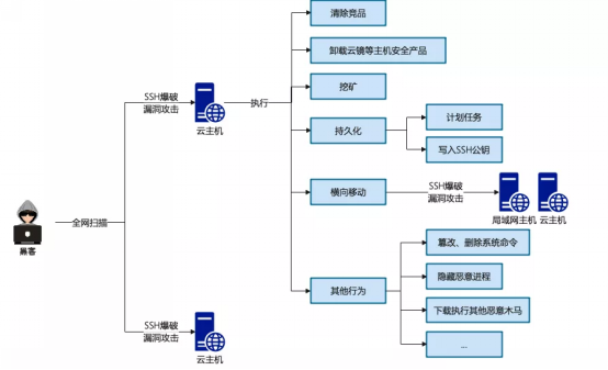 挖矿木马会占用CPU进行超频运算,从而占用主机大量的CPU资源,严重影响服务器上的其他应用的正常运行。黑客为了得到更多算力资源,一般都会对全网进行无差别扫描,同时利用SSH爆破和漏洞利用等手段攻击主机。