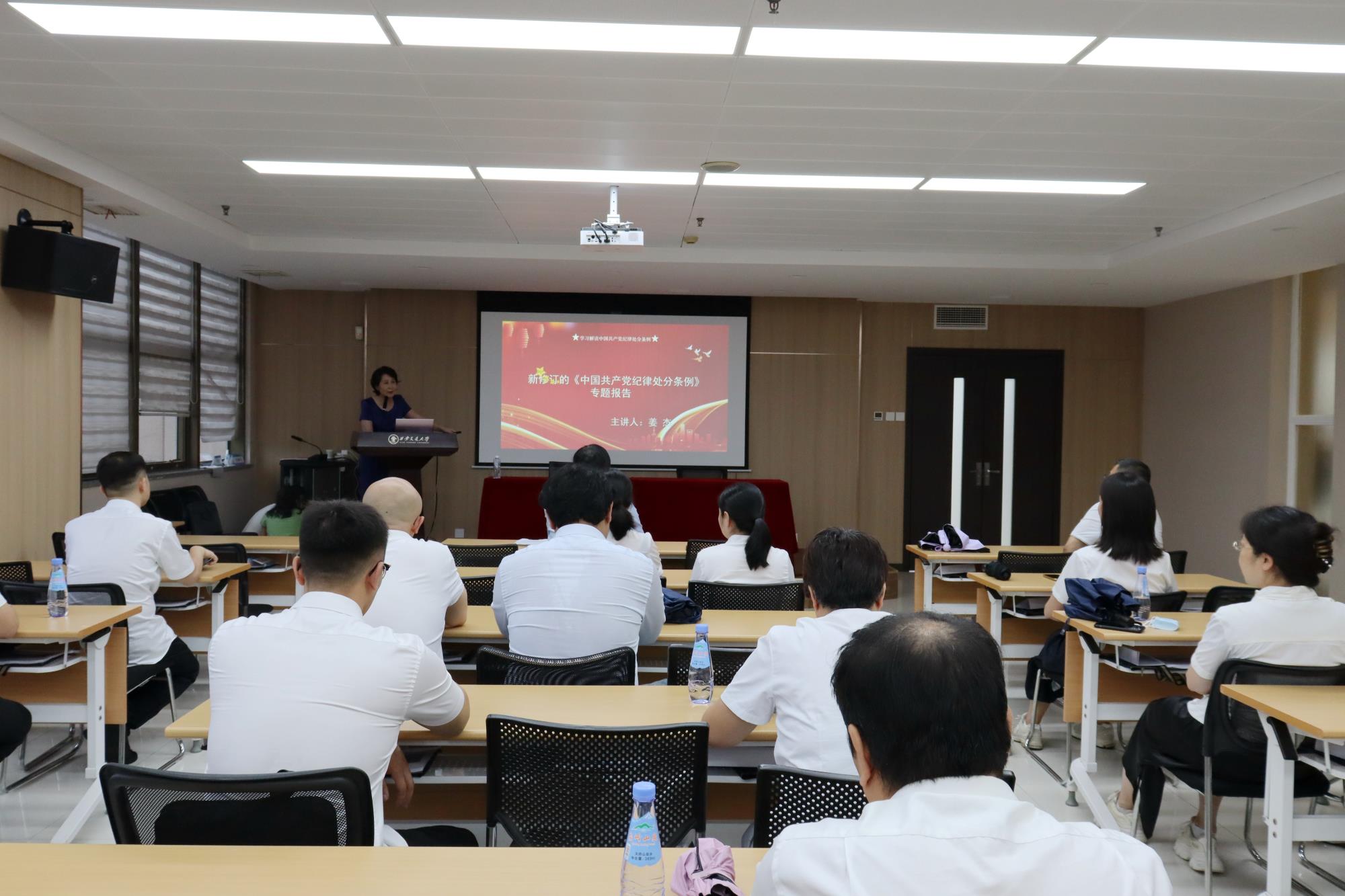在现场,公司党委特邀西安市人民检察院二级高级检察官,西安交通大学预防职务犯罪特聘教授姜杰为党员同志讲授党纪学习教育专题党课。姜教授以生动案例结合《中国共产党纪律处分条例》《中华人民共和国监察法》《国有企业管理人员处分条例》等党纪法规,从适用范围、纪法衔接、适用情形等方面进行阐释。